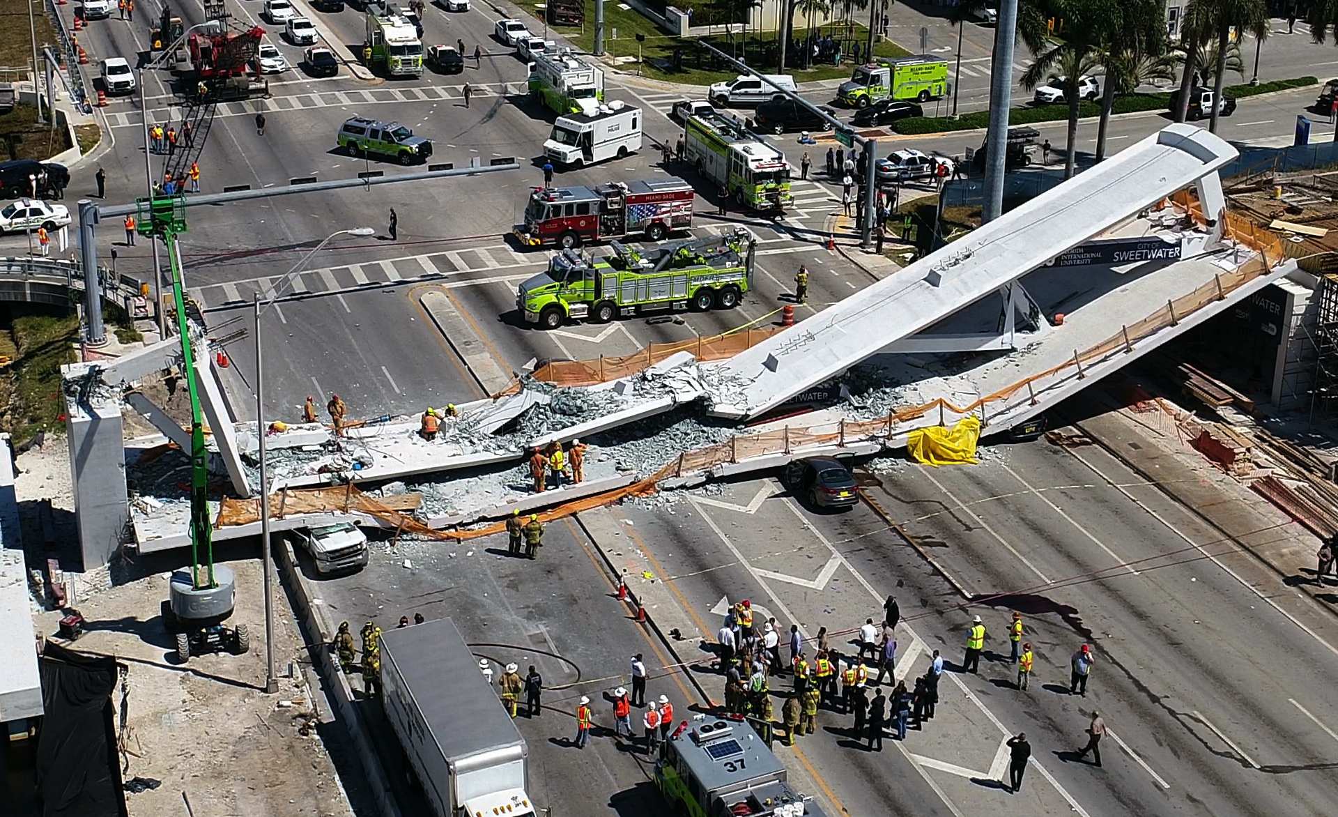 The death toll from the miami bridge collapse has risen to at least six, officials said early friday, as engineers and homicide investigators carefully picked through the dangerous scene in search for possible victims and evidence as to what went wrong. Footage has emerged of the deadly seconds a bridge crashed miami, florida bridge florida university. With at least eight vehicles still buried on friday morning news reports saying engineers may have been conducting a stress test on the bridge that may have led to its collapse could not be confirmed. Jenna mendez was heading to work at the sweetwater police department on thursday when she caught the long red light at southwest they were stopped under the bridge. A further two were sent to nearby hospitals, where one died.